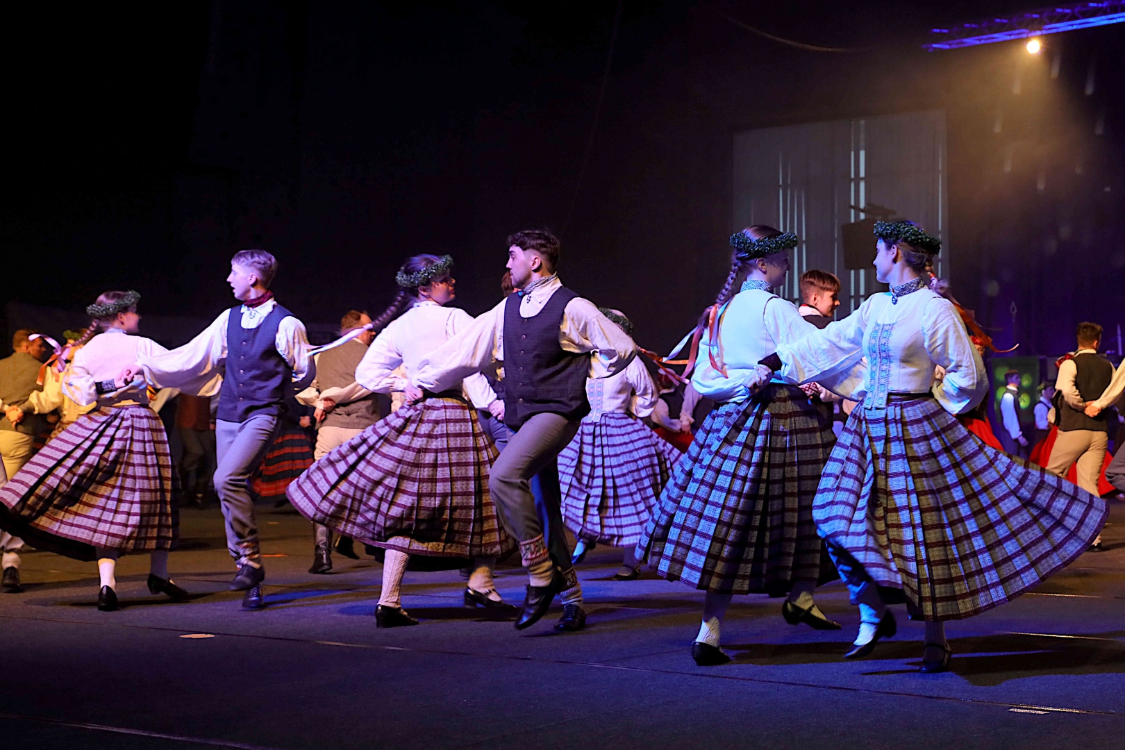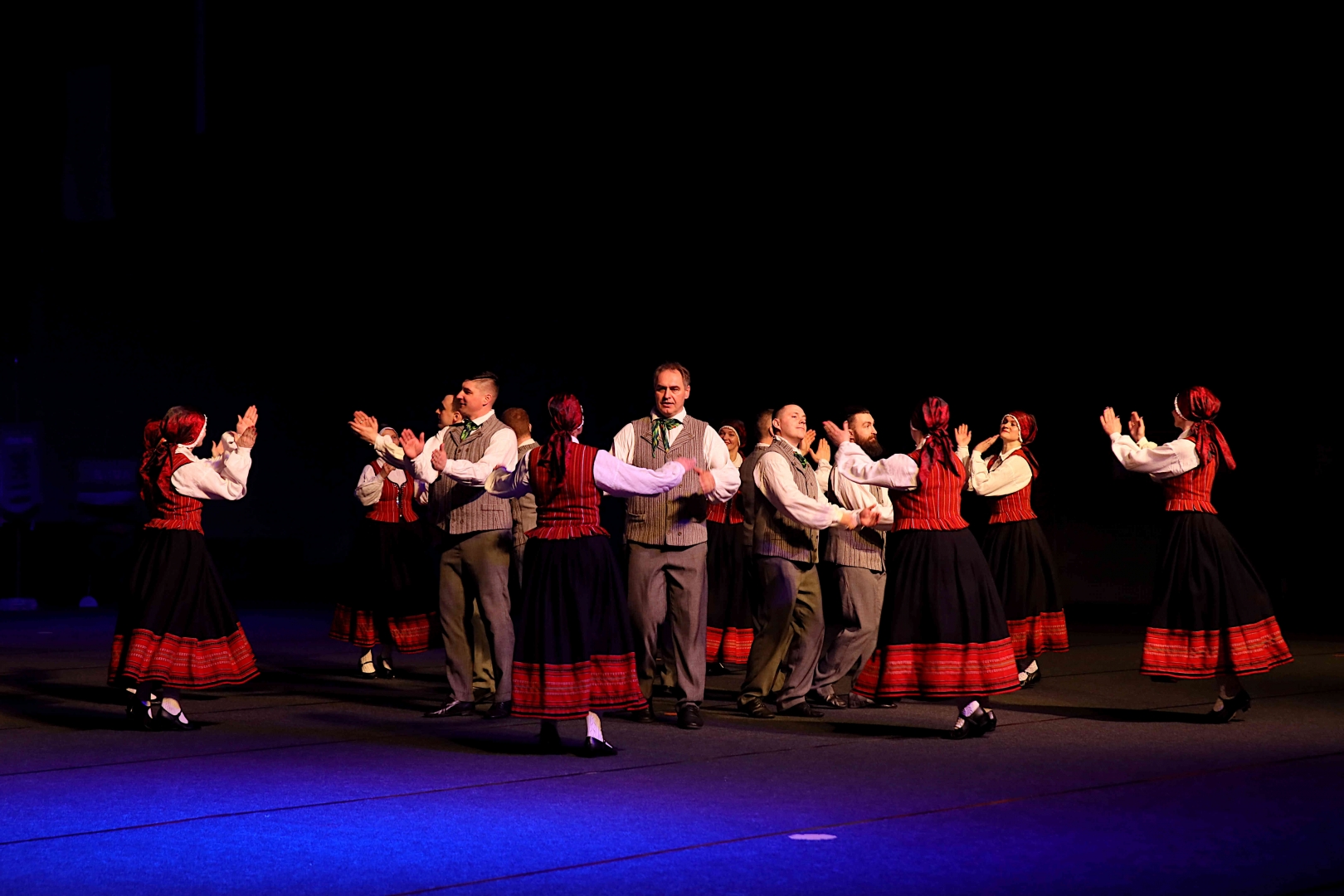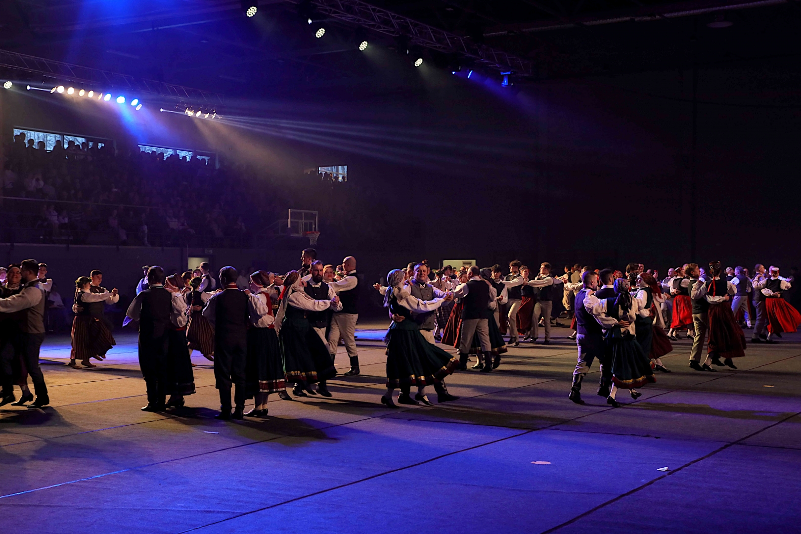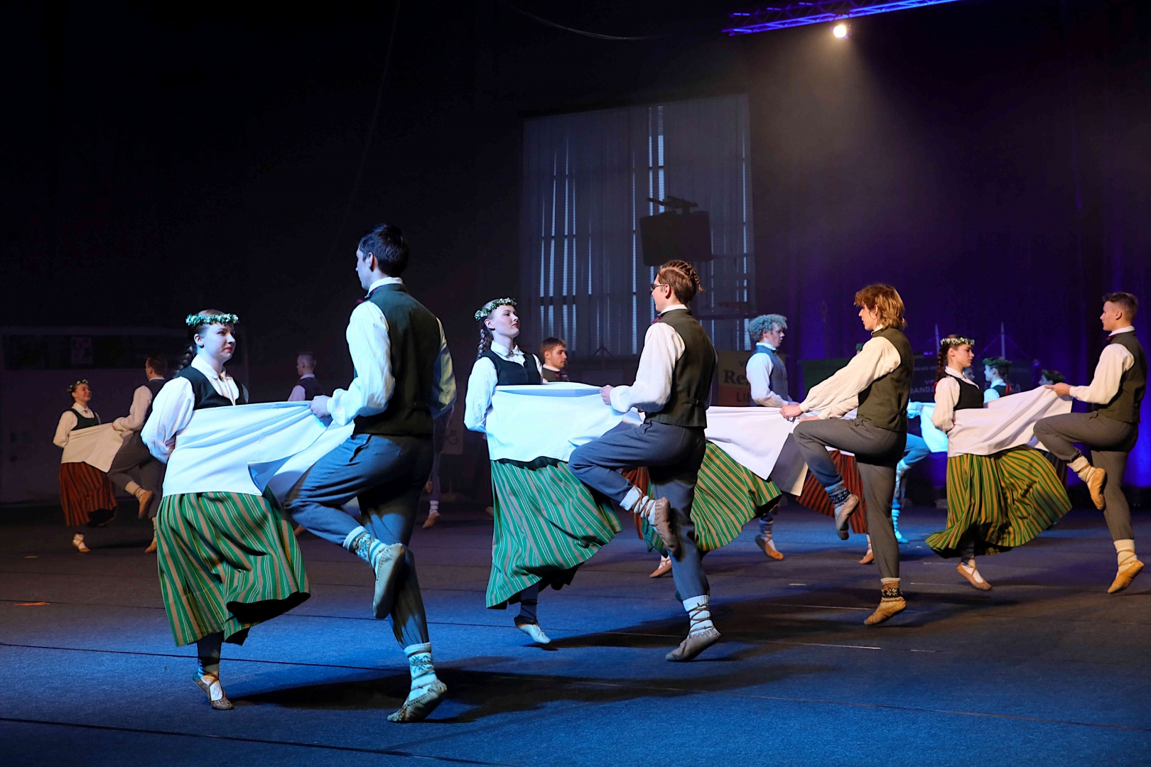 Deju koncerta laikā 25 tautas deju kolektīvi izdejoja koncepcijas autoru un režisoru Madaras Gruntmanes - Dujanas un Kaspara Bērziņa Deju svētku lieluzveduma “Mūžīgais dzinējs” repertuāru un skatuviskās dejas koncerta “Balts” un noslēguma koncerta “Kopā augšup” deju repertuāru.